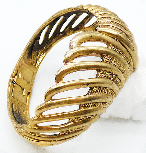 Description: Tortolani vintage gold tone hinged clamper bracelet; an open wave design layered over a textured granulated band. The opening is in top, hinge on the bottom. Signed 'Tortolan©' on the inside.