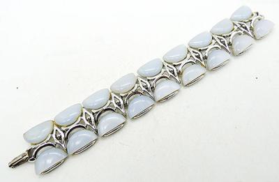 Description: Vintage mid-century pale gray moonglow lucite silver tone link bracelet; a total of nine links inset with back-to-back ultra pale cloudy gray semi-circles. Fold-over clasp.