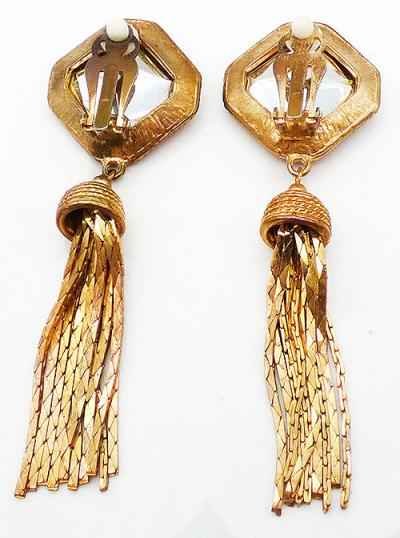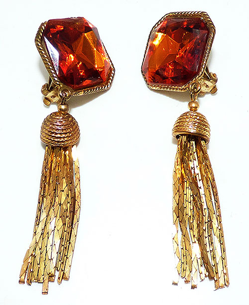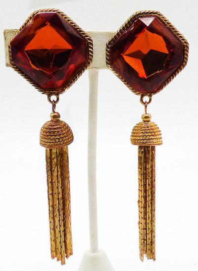Description: Vintage gold tone oversized amber acrylic stone tassel clip earrings; the huge octagonal deep amber acrylic stone is set into a gold tone twisted rope frame with a tassel made with lengths old tone herringbone chains hanging from the bottom.