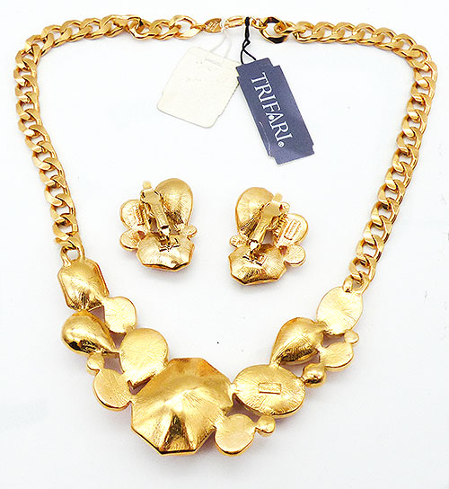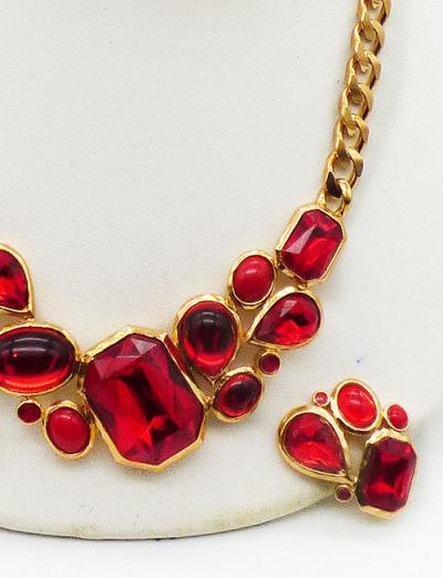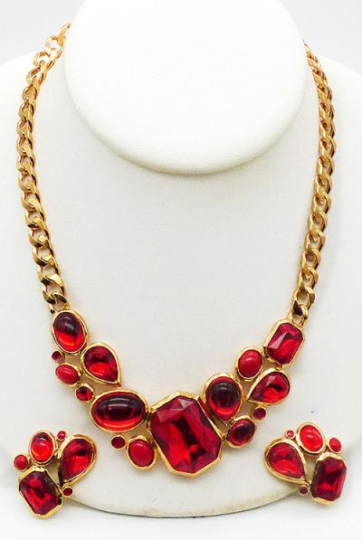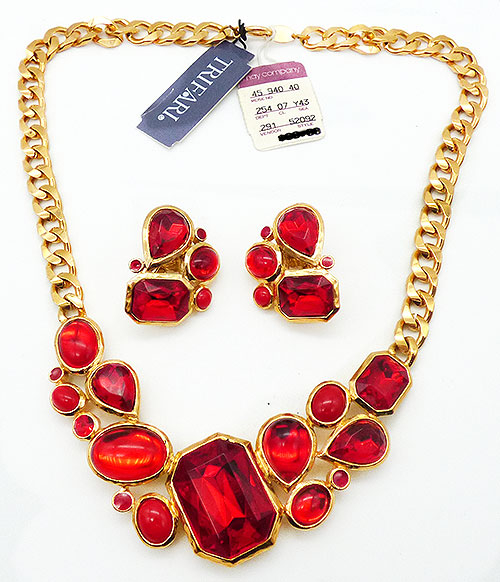 Description: Vintage 1980's-90's Trifari gold plated red acrylic stone necklace and matching clip earrings. The centerpiece of the necklace is set with an enormous tilted vibrant red acrylic octagon stone and it is flanked on either side with a combination of teardrop and oval cabochons, faceted teardrops, a smaller octagon, a small red round stone and opaque red oval cabochons. It's on a thick gold plated curb cain. The matching clip earrings are set with the same red stones. Signed 'Trifari©' on the back of the necklace, on a hang tag and of the earring clips. Original Trifari hang tags and department store hang tags on the necklace, earrings come on original dismal card.