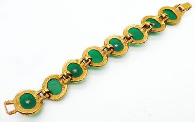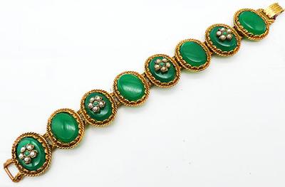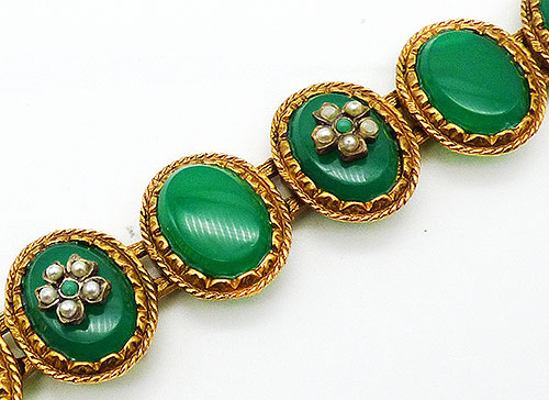 Description: Vintage green oval stone gold plated link bracelet, each link is set with a flat oval jade green hard plastic stone. Alternating links have a faux pearl floret with a small green cabochon center in the middle. Fold-over clasp.