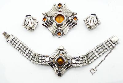 Size: Bracelet: 7" x 1 1/2", brooch: 2 1/8" x 2 1/8", earrings: 1" square