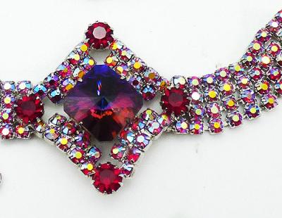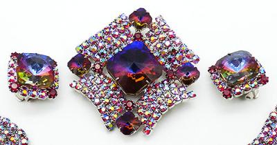 Description: Vintage silver tone ruby red aurora rhinestone and red square rivoli brooch, bracelet and clip earrings parure; the red rivolis have shades purple, blues and topaz in the stone. The brooch has a large center square rivoli with three rows of ruby aurora rhinestones on each side and much smaller square rivals in the corners. The bracelet has a centerpiece with the square rivoli and two rows of aurora on each side, red round rhinestones in the corners and a band made with four rows of ruby aurora rhinestones with a hidden push-in clasp and safety chain. The matching earrings have a square rivoli, a row of auroras on the sides and red rhinestones in the corners.