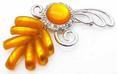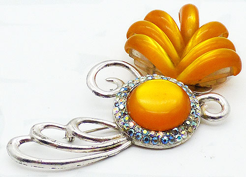 Description: Vintage silver plated enormous moonglow lucite floral brooch; vibrant curved marigold moonglow lucite petals cascade down from a large, round marigold moonglow cabochon surrounded by two rows of crystal aurora borealis rhinestones. Silver tone tendrils curl to the sides and into three loops at the top.