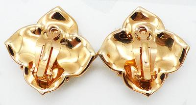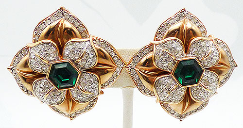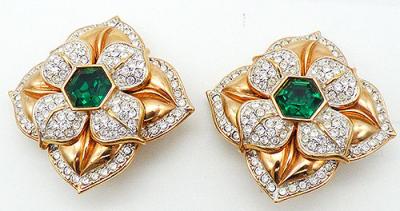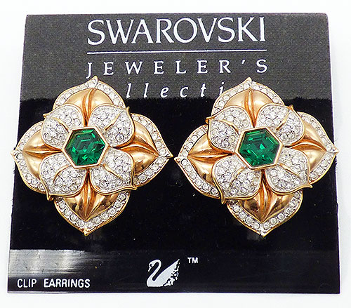 Description: Swarovski vintage gold plated clear crystal floral clip earrings; large stunning earrings from the Jeweler's Collection. Floral design with two layers of petals; the bottom layer is four larger gold plated petals edged in crystals, the top layer has four pavé crystal petals around an emerald green octagonal crystal in the center. Signed with the Swarovski Swan logo on the backs and these come on the original display card.