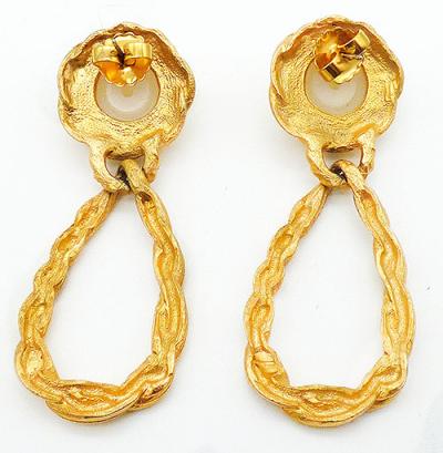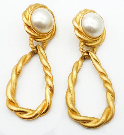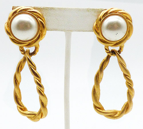 Description: Gold plated dangle and faux pearl pierced post earrings; a gold tone twisted rope teardrop loop hangs from a faux mabé glass pearl inside a twisted rope frame.