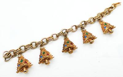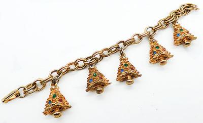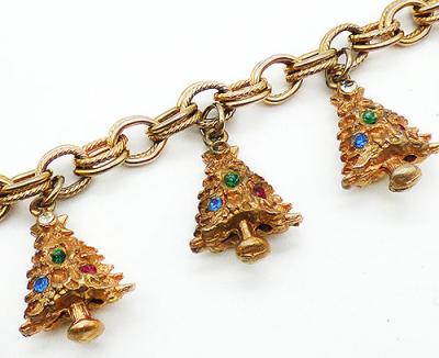 Description: Vintage gold tone Christmas tree charm bracelet; a total of five gold tone Christmas tress dangling from a gold tone chain. Each tree has realistic boughs and has a green, red and blue rhinestone ornament along with a clear rhinestone as a star on top, the same front and back. Fold-over clasp.