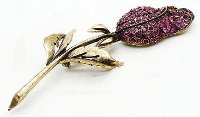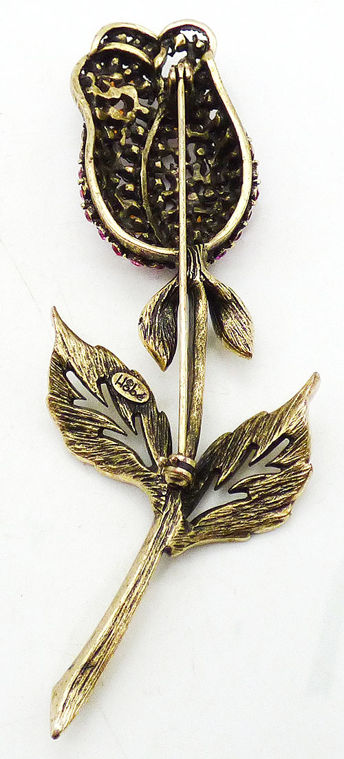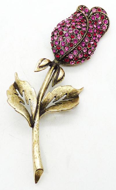 Description: Hobé vintage gold plated pink rhinestone flower brooch; a large furled rose on a very long stem with gold tone leaves. The flower petals are set with pink, fuchsia and red rhinestones and outlined with gold tone twisted wire. Signed 'Hobé©' on the back.