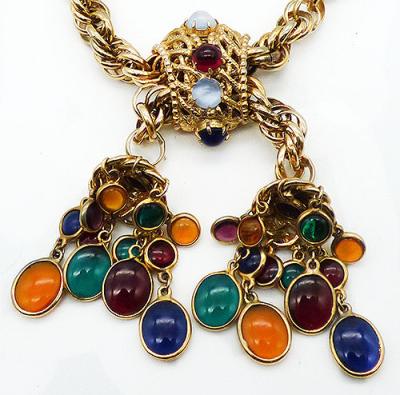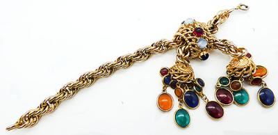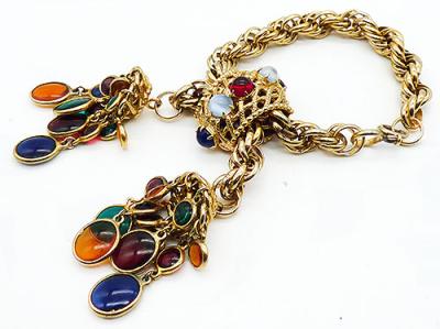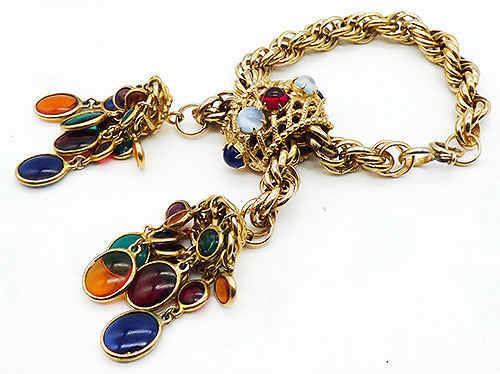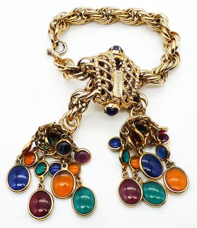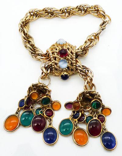 Description: Schiaparelli vintage dangling tassels gold plated twisted rope chain bracelet; a pair of tassels hang from a thick woven filigree fixed slide decorated with pale blue glass moonstone cabochons and ruby and sapphire glass cabochons. Each tassel has bezel set jewel tone glass stones hanging from a matching filigree cup. The glass colors are golden topaz, emerald green, ruby red and sapphire blue. Signed 'Schiaparelli' on the back.