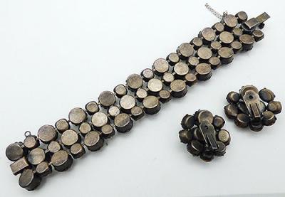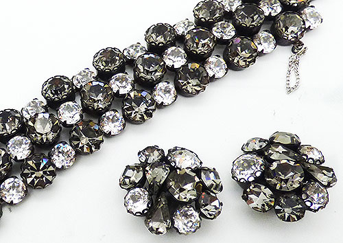 Description: Regency dark gun metal gray metal black diamond and clear rhinestone vintage bracelet and clip earrings set; the bracelet features three rows of larger round black diamond rhinestones alternating with slightly smaller clear rhinestones. The push-in clasp is set with a black diamond baguette with silver safety chain. The matching earrings have several black diamond rhinestone shapes, teardrop, round and oval, and larger clear round rhinestones. Attributed Regency.