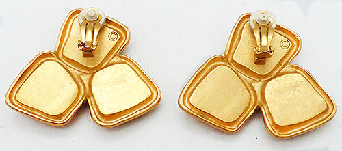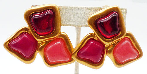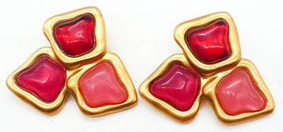 Description: Vintage matte gold plated red and pink resin stone oversized statement clip earrings; a trio of gel-like square stones, one deep red, one fuchsia and one salmon pink, are set into matte gold tone frames and arranged into a large triangle. Signed only with a large © symbols on the backs.