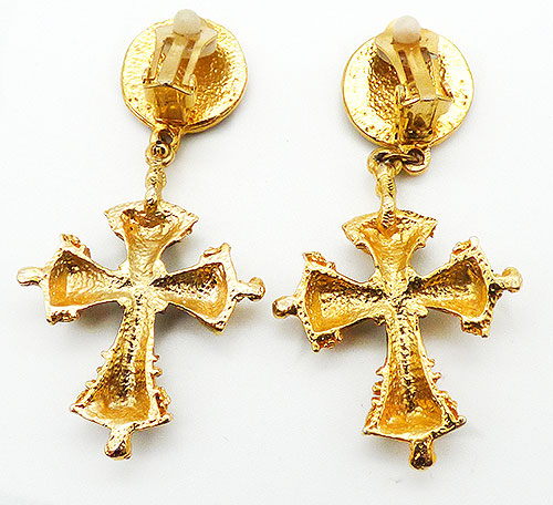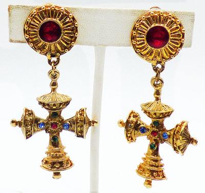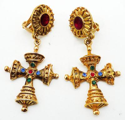 Description: Vintage gold plated Renaissance style cross clip earrings, the large heavy crosses are set wth jewel tone rhinestones and dangle from a gold tone medallion set with a large red rhinestone at the top.