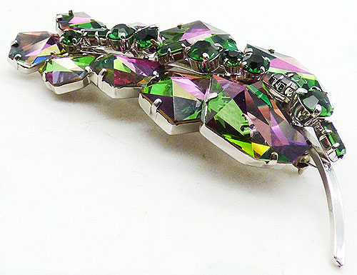 Description: Vintage amethyst and emerald gammatic glass stone leaf brooch; the graduated size faceted bi-color purple and green stones are set along a silver tone stem lined with emerald green round and baguette rhinestones.