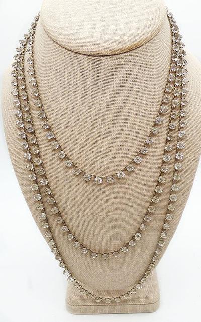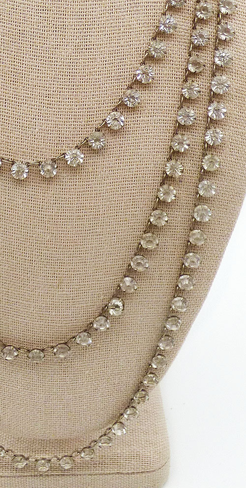 Description: Art Deco antique sterling silver and clear rhinestone triple tired necklace; the three strands consist of clear unfoiled rhinestones in linked individual open back settings. The strands attach to a sterling hidden push-in clasp set with three clear rhinestone baguettes. Hallmarked 'Sterling' on the back of the clasp.