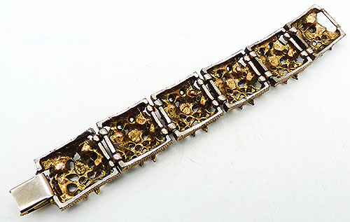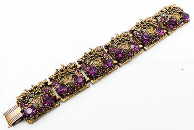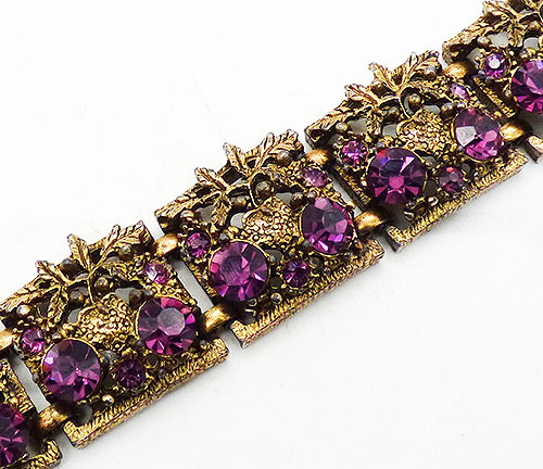 Description: Vintage gold tone strawberry and amethyst rhinestone square panel link bracelet; each of the six thick, heavy links have a textured gold metal strawberry on leafy vines nestled on a bed of different sized amethyst round rhinestones. Wide fold-over clasp.