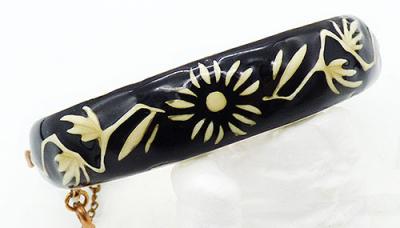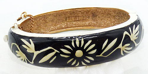 Description: Eisenberg enamel floral gold plated hinged bangle bracelet; from the 1970's Artists Series, this design is an ff-white spiky flower in the center of spiky leaves on long stems against a black enamel background. The design repeats twice, top and bottom, and the sides are enameled on the off-white. Hinged on one side, push-in clasp with gold tone safety chain on the other. Signed 'Eisenberg©' in the inside.
