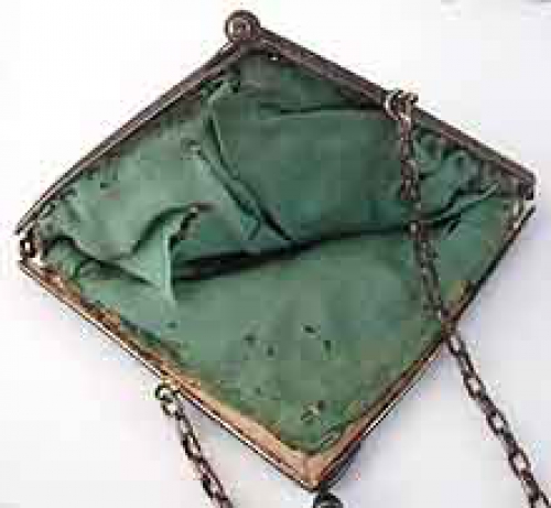 Description: Vintage diamond shaped purse from the 1930's, the outside is crocheted with larger clear glass beads. Woven in with the beads are settings for aqua rhinestones arranged in vertical stripes on both sides. The purse frame is silver metal and has a very ornate ornament in the top corner. The side of the frame is stamped with a leafy vine and the top with a border pattern. The original inside lining is an aqua silk, the color is slightly visible through the clear beads so you see just a hint of pale aqua.