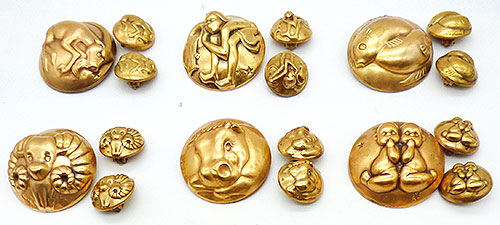 Description: Joseff of Hollywood vintage Zodiac Series extremely rare complete set of all twelve months, the matching brooches and clip earrings for each sign. This set was purchased by the original collector from the late 1940's through early 50's at Bullocks Wilshire in L.A. There is a gold plated round domed brooch and matching smaller domed earring for each month of the Zodiac. They are arranged in the picture with Capricorn at the top left and then left to right, top to bottom until Sagittarius bottom right. The Astrological signs are Capricorn (goat), Aquarius (water bearer) Picses (fish), Aries (ram), Taurus (bull), Gemini (twins), Cancer (crab), Leo (lion), Virgo (maiden), Libra (hand on scales), Scorpio (scorpion), Sagittarius (centaur). All pieces are signed 'Joseff' on the back.