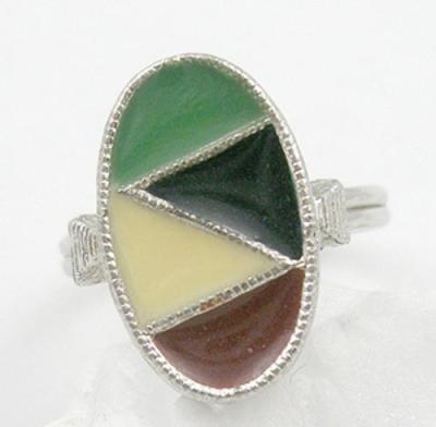 Description: Emmons silver tone ring, an oval with an enameled design of alternating triangles in green, black, ivory and brown enamel. Adjustable band. Signed '©Emmons' on the inside of the band.