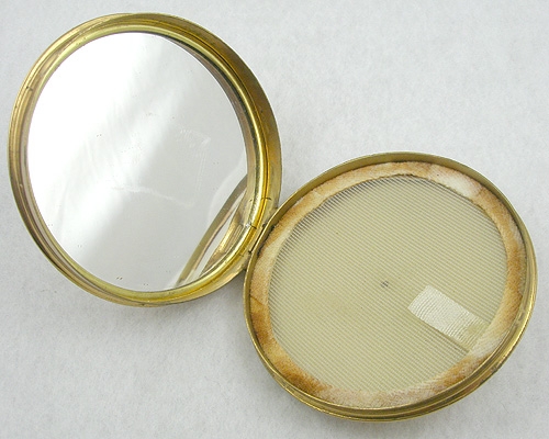 Description: Stunning vintage carved mother-of-pearl gold tone compact. The top is decorated with a heavily carved ornate mother-of-pearl snowflake with a red foil background showing through the carving. The bottom is engine turned. Original screen inside, but no make-up.