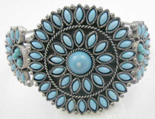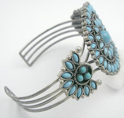 Description: Signed 1970's southwestern bracelet inspired by Zuni petit point design. The plastic turquoise stones are set in concentric circles in the center medallion and on the semi-circles flanking it. Four thick silver tone wires make up the band. Signed 'NA' or 'NR' on the back.