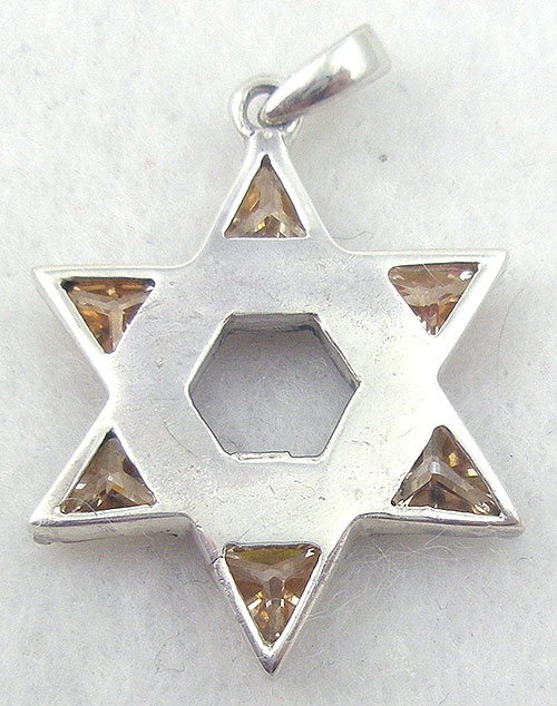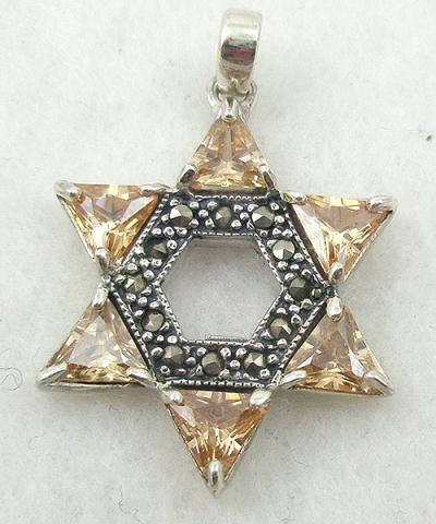 Description: Sterling silver Star of David Pendant, each point of the star is a light topaz trillion cut cubic zirconia, the inner border bead set with marcasites. Hallmarked '925' on the inner edge.