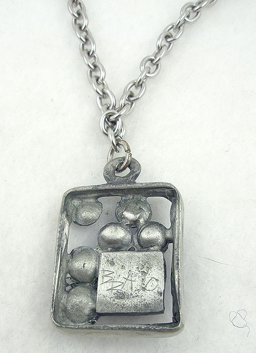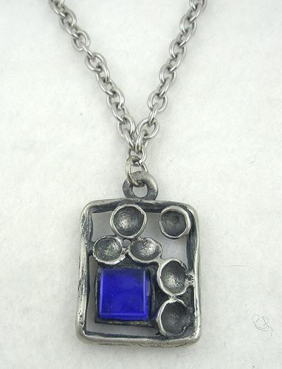 Description: Artisan Studio pewter pendant; a rectangular postmodern design with convex circles inside the frame randomly placed around a thick cobalt blue square glass stone set into the lower left corner. Comes on a long thick silver tone chain. Artist's mark 'BBA10' etched into the back.