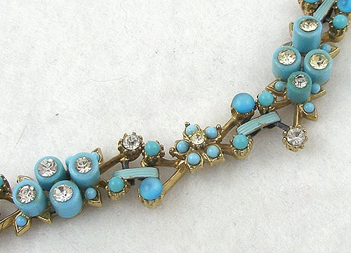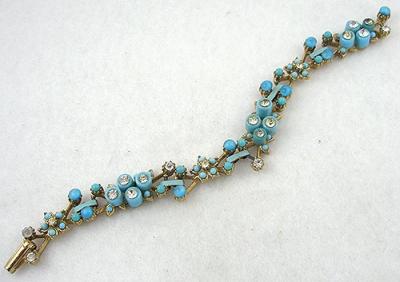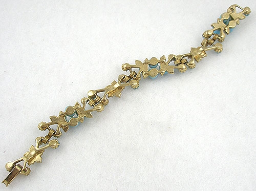Description: Vintage gold tone link bracelet; a fun design with the main links set with four aqua pillars, each with a clear rhinestone on top, small leaves set with tiny aqua cab stone, as well as aqua glass cabochons and clear rhinestones. Alternating links are flowers set with the tiny aqua cab petals and a clear rhinestone center with aqua cabs in each corner. The connecting links are enameled in aqua.