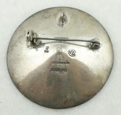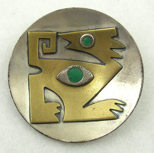 Description: Estela Popowski Mexican sterling and brass mixed metals brooch; the round concave sterling silver disc has an applied brass pre-Columbian jaguar, I think, with a Mexican jade (green onyx) eye and a second sterling and green onyx eye on the cat's belly. Hook on thr back for a chain. Signed 'Hecho en Mexico DF', 'HT 925', Eagle #20, 'Popowski' and 'Sterling' on the back.