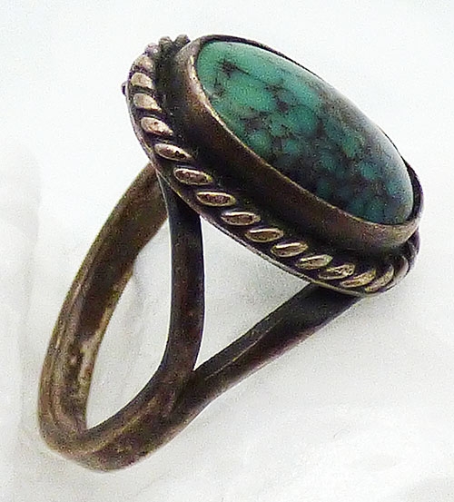 Description: Vintage Native American Old Pawn sterling silver and turquoise pinkie ring; an oval piece of green turquoise with heavy black veining in a bezel wrapped with twisted sterling wire. The double band at the sides tapers down into a single band. Tests positive for sterling silver.