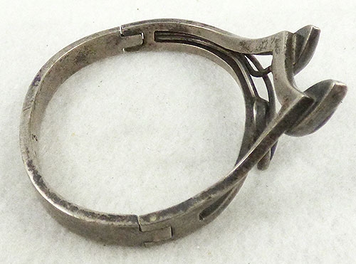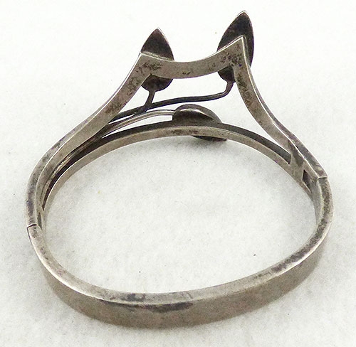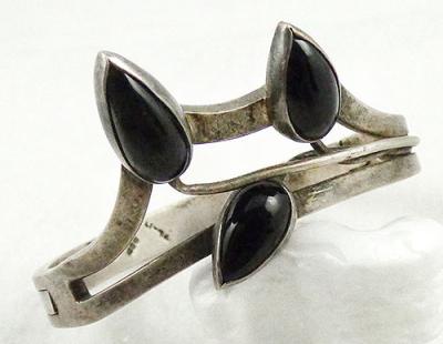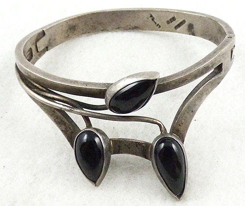 Description: Gregorio Mexican Taxco sterling silver modernist bracelet with a trio of black onyx teardrop leaves on silver wire stems. The top is made at an angle so the bracelet fits down over the top of the hand. Hinged on one side with a hidden clasp on the other. Signed '925', 'Mexico' and register mark 'TL-17 for 'Gregorio', post 1976 mark indicating made in Taxco.