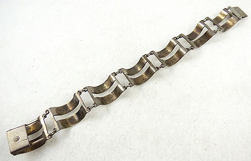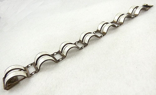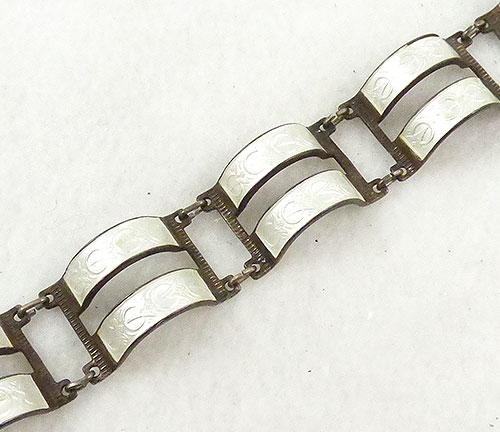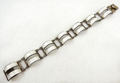 Description: Vintage Norway Arne Nordlie sterling bracelet; each of the seven links is a pair of tall semi-circular white base taille enamel bands with an angular floral vine pattern. Signed with the Noodle mark, '925', and 'S', on the back of the push-in clasp.