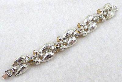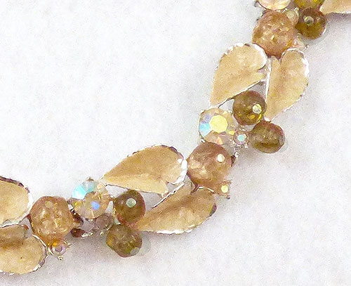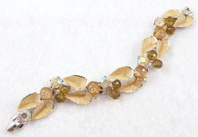 Description: Vintage yellow leaves link bracelet; each silver plated link has a pair of convex leaves enameled in a soft butter yellow combined with one small and large topaz aurora rhinestones and topaz faceted plastic beads.