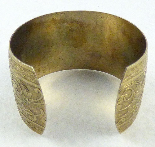 Description: Vintage 1970's gold tone cuff bracelet; the wide band is etched with a banded floral design so popular at the time and used as the base for many designs. This cuff is decorated with a flat oval goldstone glass stone.
