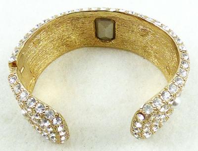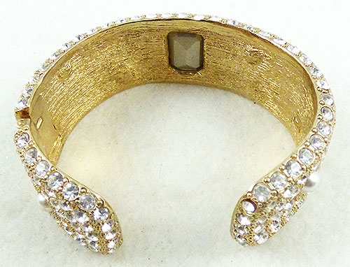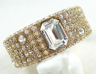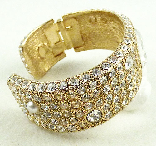Description: Contemporary gold plated all crystal rhinestone hinged bangle bracelet; originally a Kenneth J. Lane design, however this one is slightly different in that it is completely covered in rhinestones. The original design had a metal finish on the bottom sides. The bracelet is encrusted with six rows of clear Swarovski crystals and has a large cushion cut clear crystal in the center. The sides of the band are also covered with crystal rhinestones and the front is dotted with some larger crystals as well as two faux pearls on the bottom. One side is hinged for easy on/off. This design was originally produced with a different colored center stone. This all crystal version is unsigned, likely sold 'out the back door' to other retailers, by the original manufacturer. The signature cartouche is there, but it is blank.