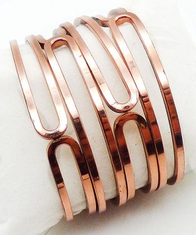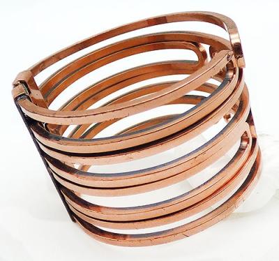 Description: Renoir copper wire oval loops hinged clamper bracelet; square copper wires form oval loops that meet at the top, with the loop ends are alternating and staggered so they are interwoven. Mid-century modernist design. Signed '©Copper' on the hinge.