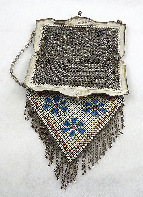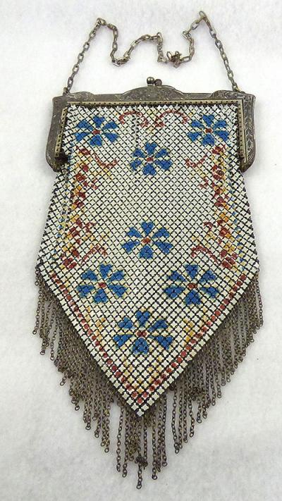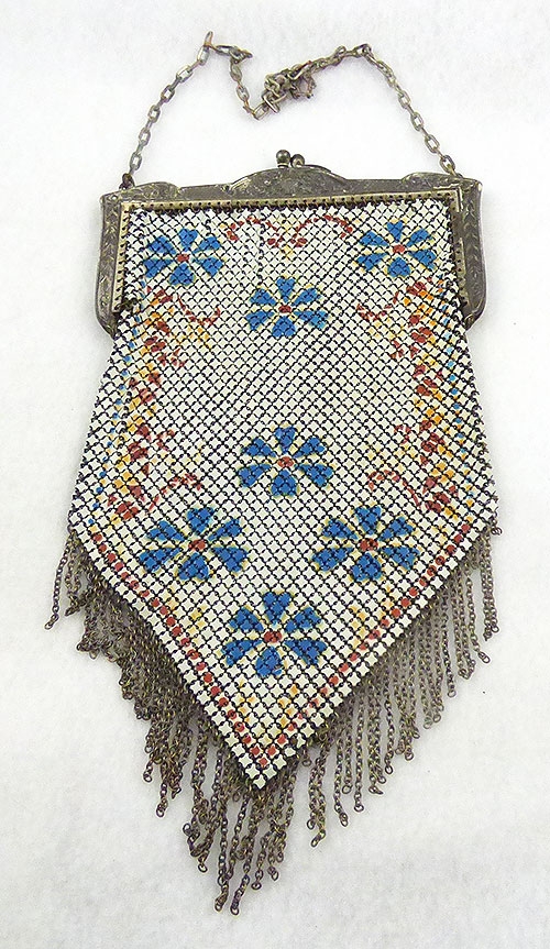 Description: Mandalian vintage flapper era enamel mesh purse; white enameled metal mesh with blue flowers with red centers and a red and orange border design. Metal chain fringe along the bottom edge and and ornate floral silver frame with chain handle. Same design front and back. Signed 'Mandalian' on the inside of the frame.
