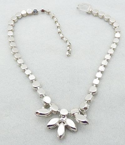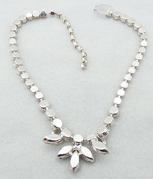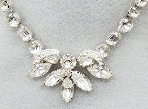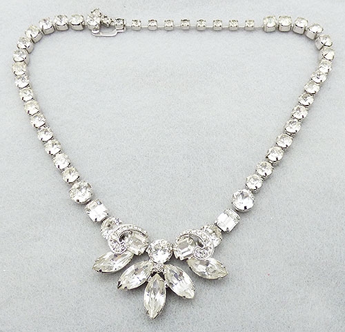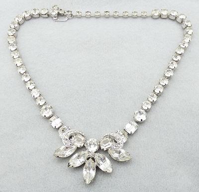 Description: Eisenberg vintage clear rhinestone silver plated necklace; the center has a fan of clear rhinestone navettes below larger round and baguette clear rhinestones with two curls set with small clear rhinestones overlapping at the sides. The rest of the necklace is slightly smaller clear round rhinestone chain with extender chain on one end and hook on the other. All stones prong set. Signed 'Eisenberg' in black letters on the back of the hook.