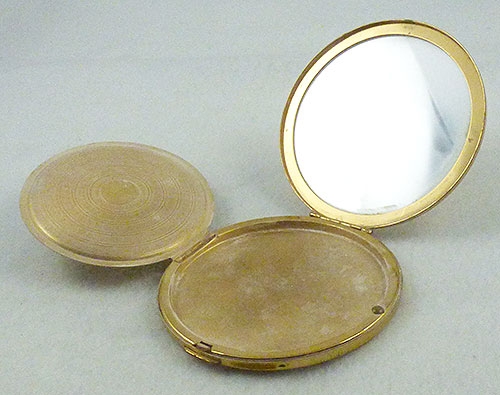 Description: Elgin American gold tone round compact; the top has an etched vine of leaves around the border. Inside, mirror is on top half, compartment for power on the bottom. Signed 'Elgin American Made in U.S.A' on the inside.