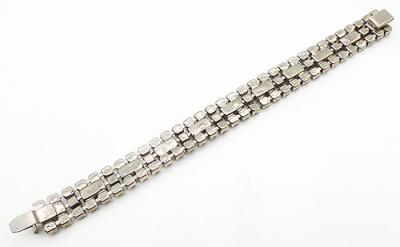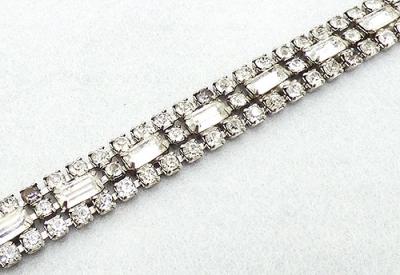 Description: Weiss vintage silver tone clear rhinestone bracelet; a center row of clear rhinestones baguettes alternating with clear round rhinestones and out rows clear round rhinestones. Hidden push-in clasp, signed 'Weiss' o n the back.