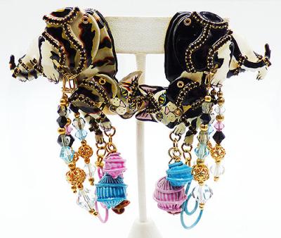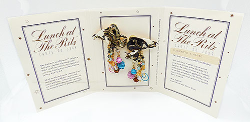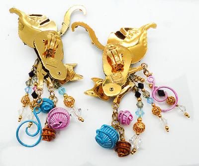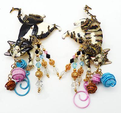Description: Lunch at the Ritz vintage "Claudette & Algie' cats gold tone clip earrings; two different cats, one black and white enamel, the other a gray and black enamel tabby with a white belly, both with black rhinestone row accents. Both cats are completely articulated, with their legs, boidy, tails and heads on rivets that allow them to move independantly. Balls of pink, turquoise and and rust string dangle from the cats along with pink or turquoise spirals and crystal and gold bead strands. Signed 'Lunch at the Ritz' on plaques on the backs and these come on their original Carte du Jour menu display card.