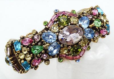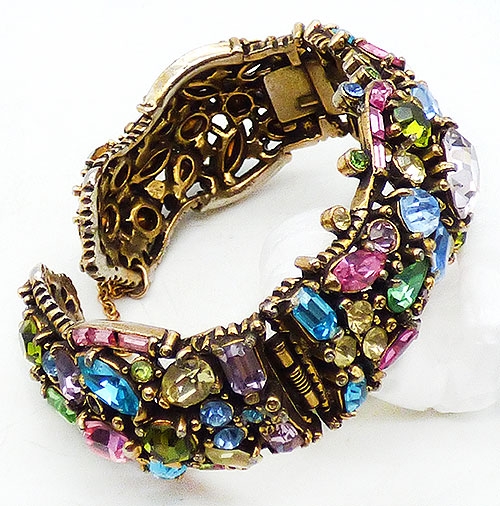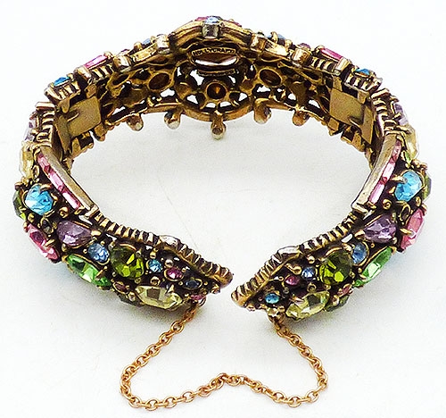 Description: Holycraft vintage 1955 pastel rhinestone gold tone clamper bracelet; hinged on both sides for easy on/off and adjustability. The top is round with a large oval lavender rhinestone center surrounded by light blue ovals, round olivine and smaller jonquil yellow round rhinestones with pink rhinestone baguettes at the edges. The rest of the top section is set with a mix of various pastel colored rhinestones in a variety of shapes; aqua baguettes, pink navettes, light green teardrops and more. The band on either side of the hinges is covered with still more pastels; aqua navettes, lavender baguettes, pink teardrops and baguettes, pale yellow ovals and a mix of small pastel round rhinestones. Gold tone safety chain connects to the ends. Signed 'Hollycraft Corp 1955' on back.