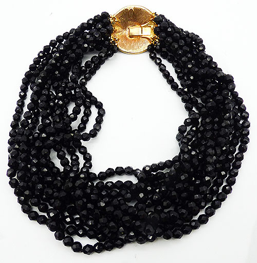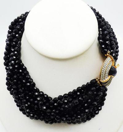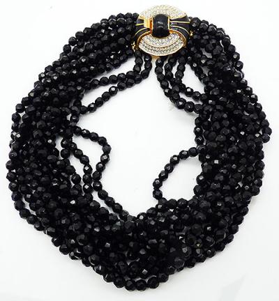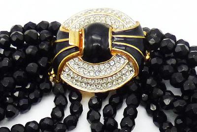 Description: Kenneth Lane KJL vintage French jet torsade necklace with clear rhinestone and black enamel gold plated push-in clasp. A total of eleven strands of French jet, or faceted black glass beads attached to an oversized gold plated clasp with a black enamel dome in the center of two rings of clear rhinestones with black enamel fans overlapping the rings. Signed 'Kenneth ©Lane' on the back, mark used from 1990 forward, this necklace dates between 1990-2015.