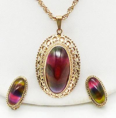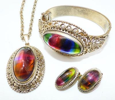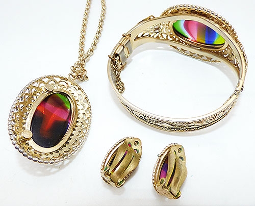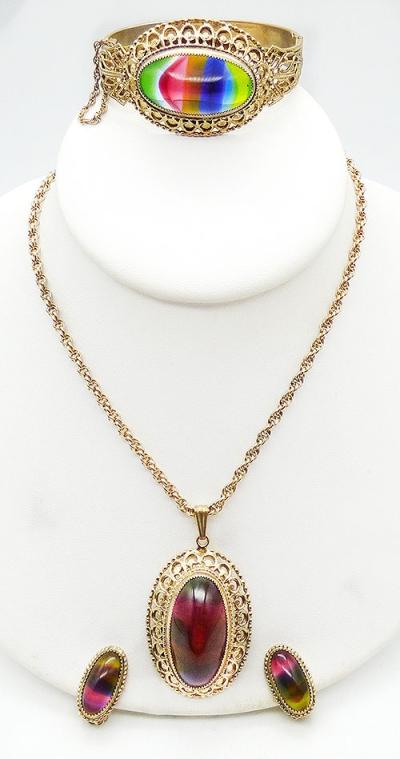 Description: Whiting and Davis vintage gold plated and rainbow striped cabochon parure consisting of a matching pendant necklace, hinged bracelet and clip earrings. The pendant is a large oval rainbow glass cabochon in a gold tone filigree frame on a gold tone chain. The bracelet has a rainbow glass cabochon in an oval frame, matching the pendant, and set on top of the gold tone filigree side hinged band with a push-in clasp and safety chain. The clip earrings have much smaller rainbow glass cabochons set into much simpler gold tone frames. Signed 'Whiting and Davis' on the necklace hang tag, on the inside of the bracelet hinge and on the clips.