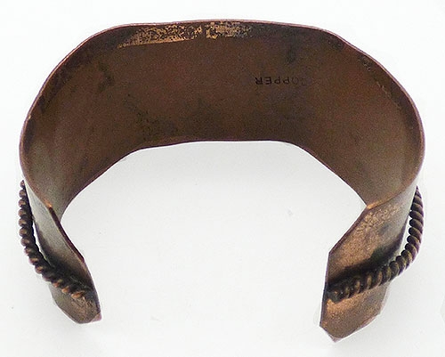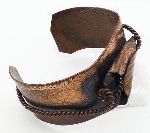 Description: Vintage mid-century artisan hand copper cuff bracelet; 3-dimensional hand wrought copper flower with a twisted a thick copper wire on both sides applied to the middle of the band. Hallmarked 'Copper' on the inside.
