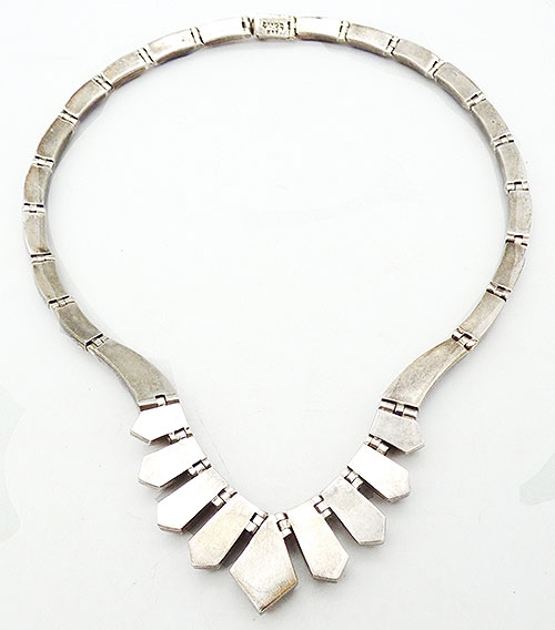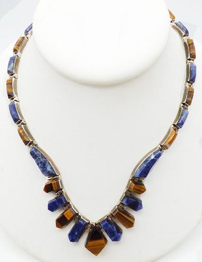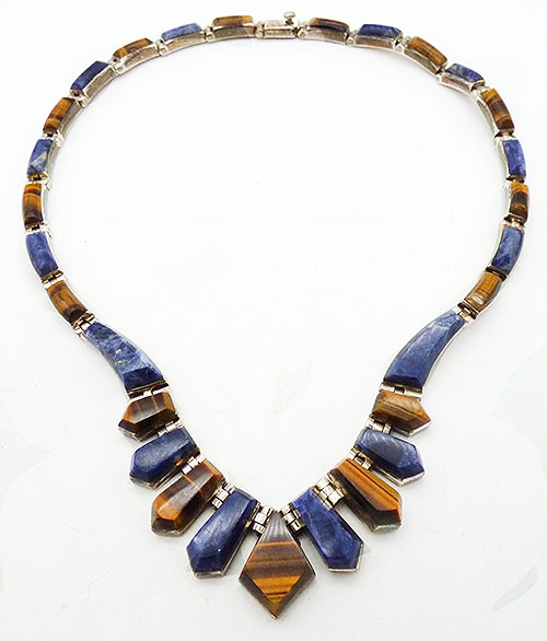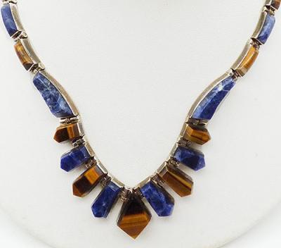 Description: Taxco vintage Mexican 950 silver sodalite and tiger eye link necklace. Alternating blue sodalite and tiger eye stone pieces are set into sterling links; the front links are vertical with a diamond shaped tiger eye in the center, graduated coffin shaped pieces on either side and then the links are slightly curved rectangles to finish the necklace. Sterling push-in clasp is signed 'Mexico TN-57 950' on the back.