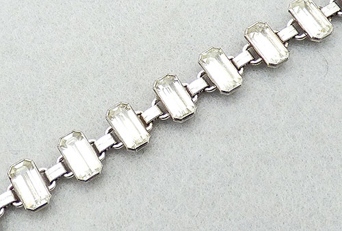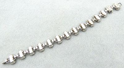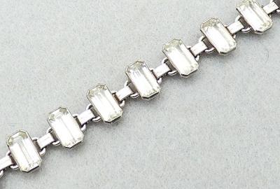 Description: Engel Brothers sterling silver clear rhinestone baguette Art Deco line bracelet; each of the large prong set crystal baguette rhinestones are linked with small square sterling connectors. Fold-over clasp signed '