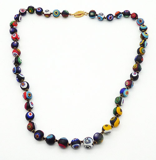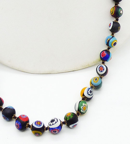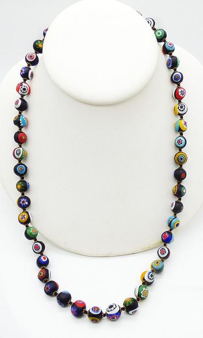 Description: Venetian black millefiori Murano glass bead necklace; the round beads have a matte finish instead of being polished. The single strand is hand knotted on black silk and each bead has a tiny gold tone end cap. The beads all have at least three millefiori glass flowers, some more, each is different and the colors include vibrant red, blue, white, yellow, aqua, green and brown. Flat oval gold plated pushing clasp.