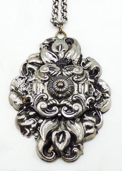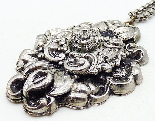 Description: Victorian Revival repoussé style silver plated floral pendant necklace; the large elaborate dimensional pendant has a centerpiece with cannetille style spiral center surrounded by cornucopia and scrolls. It's layered over a base with lilies and leaves at the top and bottom and more flowers at the sides. Come on original silver tone chain.