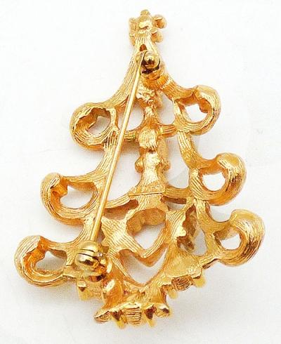 Description: Monet gold plated Christmas tree brooch; curling ribbon boughs set with multi-colored jewel tone rhinestone lights - clear, red, blue, green, amethyst and topaz - larger stones in the center. Signed '©Monet' on the back.